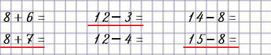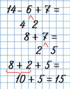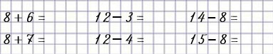 | 8 + 7 = 8 + 2 + 5 = 15 | 12 - 4 = 12 - 2 - 2 = 8 | 15 - 8 = 15 - 5 - 3 = 7 |