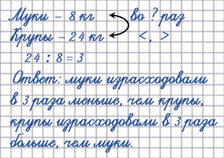 1. В столовой израсходовали 8 кг муки и 24 кг крупы. Во сколько раз меньше израсходовали муки, чем крупы? Во сколько раз больше израсходовали крупы, чем муки?