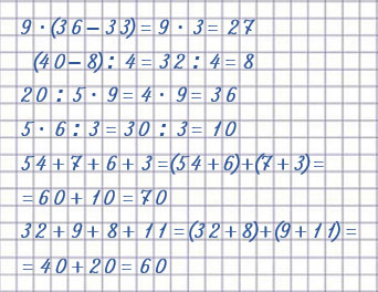 | 9 • (36 - 33) = 9 • 3 = 27 | 20 : 5 • 9 = 4 • 9 = 36 |
