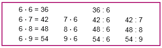 | 3 • 6 = 18 5 • 6 = 30 7 • 6 = 42 9 • 6 = 54 10 • 6 = 60 1 • 6 = 6 | 12 : 6 = 2 24 : 6 = 4 48 : 6 = 8 42 : 6 = 7 60 : 6 = 10 6 : 6 = 1 |