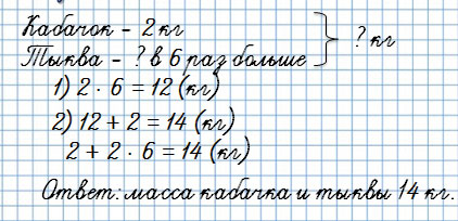 3. Масса кабачка 2 кг, а масса тыквы в 6 раз больше. Чему равна масса кабачка и тыквы вместе?