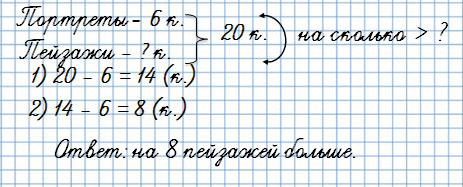 7. В зале музея выставили 20 картин, из них 6 портретов, остальные - пейзажи. На сколько больше выставили пейзажей, чем портретов?