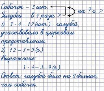 17. В цирковом представлении участвовали 3 собачки, а голубей было в 4 раза больше. На сколько больше было голубей, чем собачек?