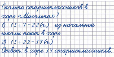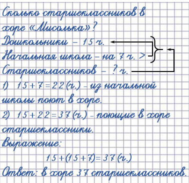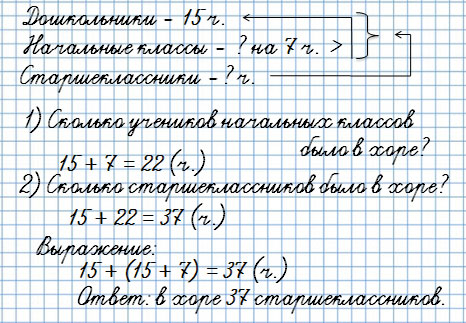 18. В хоре "Мисолька" 15 дошкольников, учеников начальной школы на 7 больше, а старшеклассников столько, сколько дошкольников и учеников начальной школы вместе. Сколько ... ?