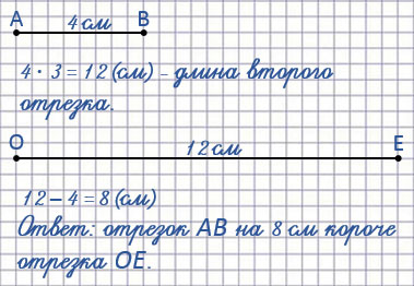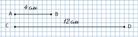 22. Начерти два отрезка так, чтобы длина одного была 4 см, а длина другого - в 3 раза больше. Обозначь отрезки буквами и узнай, на сколько сантиметров один из них короче другого.