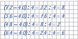 (56 - 40) : 4 = 4 (64 - 40) : 4 = 6