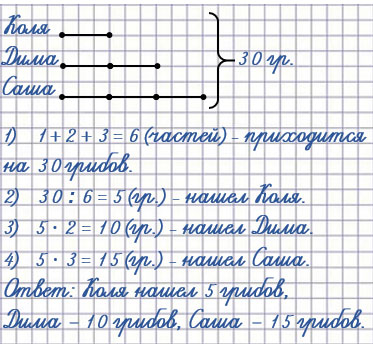 8. Коля, Дима и Саша собрали вместе 30 грибов. Дима нашёл в 2 раза больше грибов, чем Коля, а Коля - в 3 раза меньше, чем Саша. Сколько грибов нашёл каждый из них?