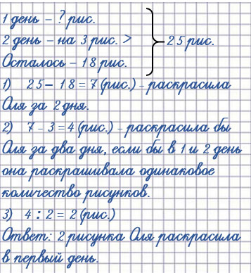 9. В альбоме для раскрашивания было 25 рисунков. В первый день Оля раскрасила несколько рисунков, во второй - на 3 рисунка больше, чем в первый. После этого 18 рисунков остались нераскрашенными. Сколько рисунков Оля раскрасила в первый день?