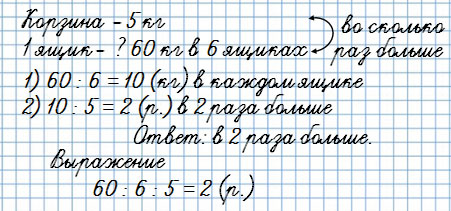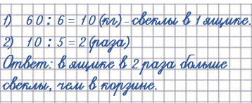 3. В корзине было 5 кг свёклы, а в 6 одинаковых ящиках - 60 кг. Во сколько раз больше было свёклы в одном ящике, чем в корзине?
