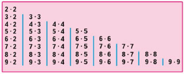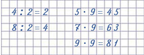 | 4 : 2 = 2 8 : 2 = 4 | 5 • 9 = 45 7 • 9 = 63 9 • 9 = 81 |