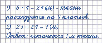 3. В куске 25 м ткани. Хватит ли этой ткани, чтобы сшить 6 платьев, расходуя на каждое по 3 м ткани? Сколько метров ткани останется, если расходовать на каждое по 4 м?