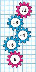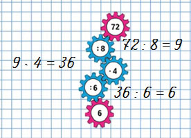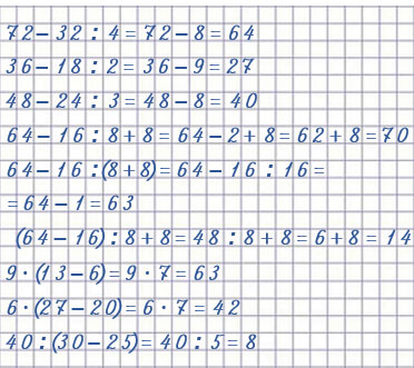 | 72 - 32 : 4 = 64 1) 32 : 4 = 8 2) 72 - 8 = 64 | 64 - 16 : 8 + 8 = 70 1) 16 : 8 = 2 2) 64 - 2 = 62 3) 62 + 8 = 70 |