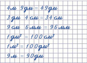 | 4 м 9 дм = 49 дм | 1 дм2 = 100 см2 |
