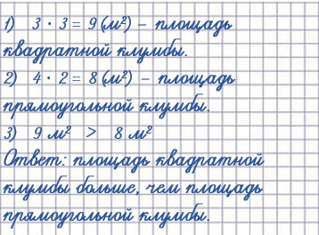 6. У входа в парк были две цветочные клумбы. Одна клумба имела форму квадрата, длина стороны которого 3 м, а другая - форму прямоугольника, длины сторон которого 4 м и 2 м. У какой клумбы площадь больше? Что можно сказать про их периметры?
