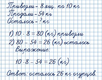 В палатке было 8 ящиков огурцов, по 10 кг в каждом. До обеденного перерыва продали 54 кг. Сколько килограммов огурцов осталось?