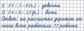 2. Ребята расчищали от снега дорожки около школы. Мальчиков было 24, а девочек — в 3 раза меньше. Сколько всего ребят работало на расчистке дорожек от снега?