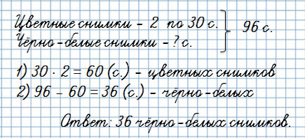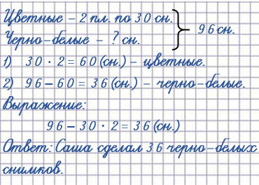 4. За время каникул Саша сделал 96 фотоснимков. Он отснял две цветные плёнки, по 30 снимков на каждой, и одну целую чёрно-белую плёнку. Сколько чёрно-белых снимков сделал Саша?