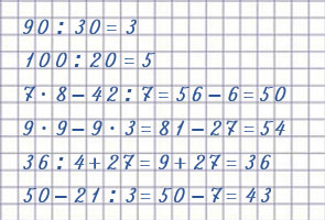 | 7 • 8 - 42 : 7 = 50 1) 7 • 8 = 56 2) 42 : 7 = 6 3) 56 - 6 = 50 | 50 - 21 : 3 = 43 1) 21 : 3 = 7 2) 50 - 7 = 43 |