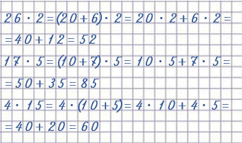 26 • 2 = (20 + 6) • 2 = 40 + 12 = 52