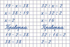| 18 • х = 54 х = 54 : 18 х = 3 18 • 3 = 54 54 = 54 | х : 16 = 3 х = 16 • 3 х = 48 48 : 16 = 3 3 = 3 | 57 : х = 3 х = 57 : 3 х = 19 57 : 19 = 3 3 = 3 |