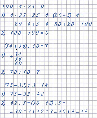 | 51 : 3 • 4 = 68 | (75 - 33) : 3 = 14 |