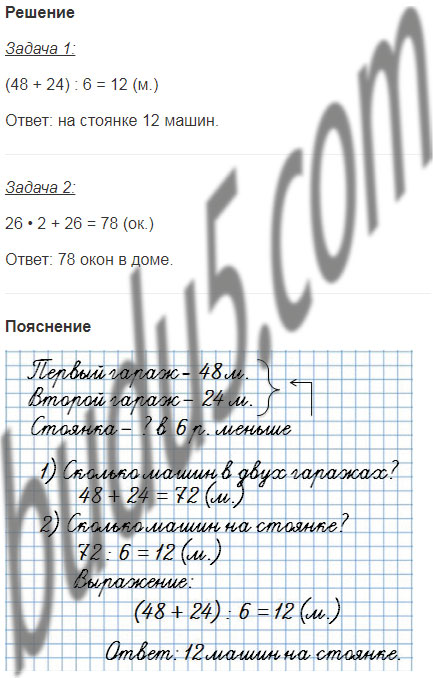 1) В одном гараже 48 машин, в другом — 24, а на стоянке в 6 раз меньше машин, чем в этих двух гаражах. Сколько машин на стоянке?