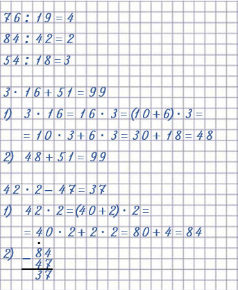 | 42 • 2 - 47 = 84 - 47 = 37 | 100 - 78 : 6 = 100 - 13 = 87 |