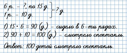6. На спектакле в школьном зале дети сидели в 6 рядах по 15 человек и ещё в одном ряду сидели 10 человек. Сколько детей смотрело спектакль?