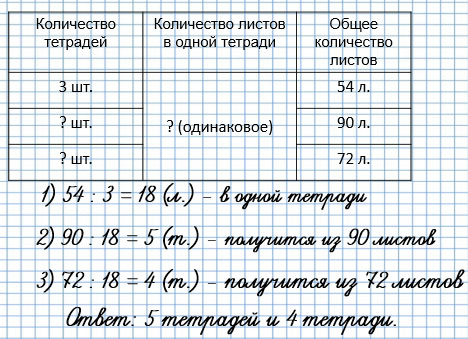 3. В трёх одинаковых тетрадях 54 листа бумаги. Сколько таких тетрадей получится из 90 листов? из 72 листов?
