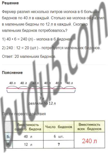 | Вместимость одного бидона | Число бидонов | Вместимость всех бидонов | |