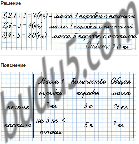 43. Масса трёх одинаковых по массе коробок с печеньем равна 21 кг. Коробка с пастилой на 3 кг легче коробки с печеньем. Чему равна масса 5 таких коробок с пастилой?