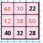 40 + 32 + 28 = 100 - сумма в каждой строке, каждом столбце и из угла в угол.