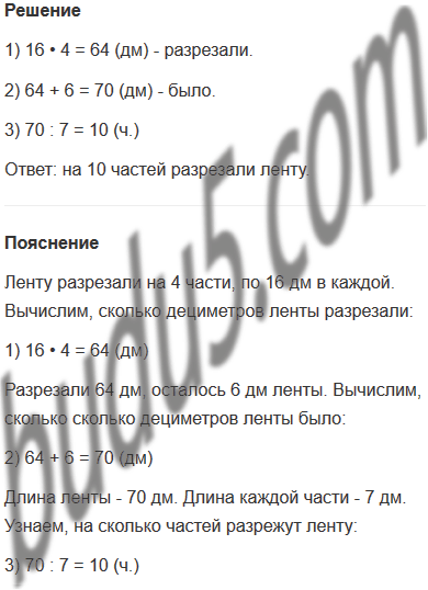 5. Если ленту разрезать на 4 части, по 16 дм в каждой, то останется ещё 6 дм ленты. На сколько частей разрежут ленту, если длина каждой части будет 7 дм?