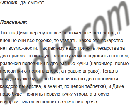 Для заболевшего Димы врач оставил шесть внешне одинаковых таблеток - по две каждого из трёх видов лекарств. Диме нужно принять три таблетки утром (по одной каждого вида) и три вечером. Однако Дима перепутал все лекарства. Сможет ли он выполнить назначение врача?