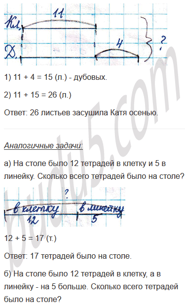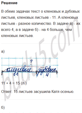 б) Осенью Катя засушила 11 кленовых листьев, а дубовых - на 4 больше. Сколько всего листьев засушила Катя осенью?