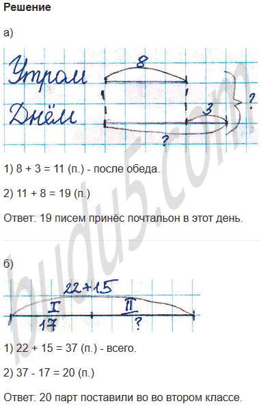 а) Почтальон принёс в дом в первой половине дня 8 писем, а после обеда - на 3 письма больше. Сколько всего писем принёс почтальон в этот день?