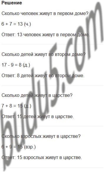 Задание № 8. В некотором царстве всего 2 дома. В первом доме живут 7 детей и 6 взрослых, а во втором доме - 17 человек, из которых 9 взрослых. Составь по схеме вопросы к этому условию и ответь на них. Что ещё можно спросить?