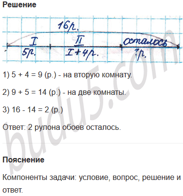 Задание № 8. Для ремонта квартиры купили 16 рулонов обоев. На первую комнату пошло 5 рулонов, а на вторую - на 4 рулона больше, чем на первую. Сколько рулонов обоев осталось?