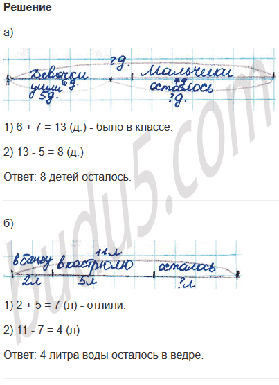 а) В классе было 6 девочек и 7 мальчиков. Потом 5 детей на автобусе уехали домой. Сколько детей осталось?
