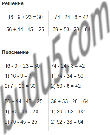 | 16 - 9 + 23 | 74 - 24 - 8 | 56 + 14 - 45 | 39 + 53 - 28 |