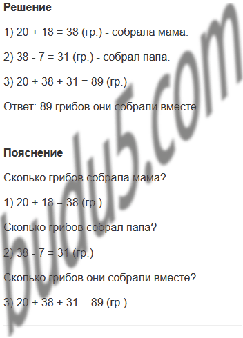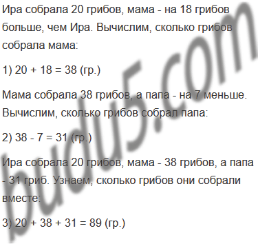 Задание № 6. Ира с мамой и папой ходили по грибы. Когда они сосчитали собранные грибы, то оказалось, что Ира собрала 20 грибов, мама - на 18 грибов больше, чем Ира, а папа - на 7 меньше, чем мама. Сколько грибов они собрали вместе?
