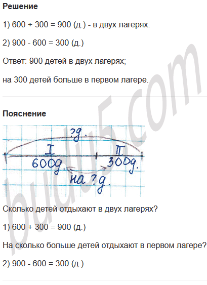 Задание № 8. В первом летнем лагере отдыхают 600 детей, а во втором - 300 детей. Поставь вопросы к этому условию и ответь на них.