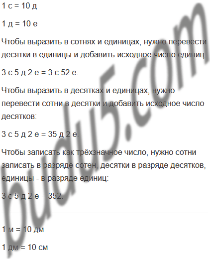 Задание № 1. Объясни по рисунку, как выразить в разных единицах счёта 3 с 5 д 2 е? Как выразить в разных единицах измерения 3 м 5 дм 2 см? Что ты замечаешь?
