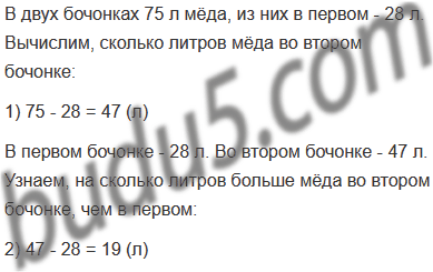 б) У мишки в двух бочонках 75 л мёда. В первом бочонке - 28 л. На сколько литров больше мёда во втором бочонке, чем в первом?