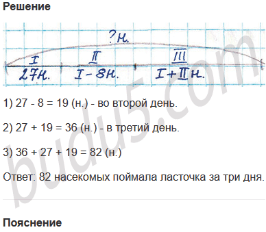 Задание № 10. Ласточка поймала в первый день 27 насекомых, во второй - на 8 насекомых меньше, чем в первый, а в третий - столько, сколько в первый и во второй дни вместе. Сколько насекомых поймала ласточка за три дня?
