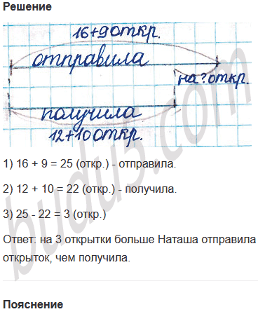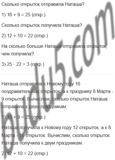 Задание № 8. Наташа отправила к Новому году 16 поздравительных открыток, а к празднику 8 Марта - 9 открыток. Сама она получила к Новому году 12 открыток, а к 8 Марта - 10 открыток. На сколько больше Наташа отправила открыток к этим двум праздникам, чем получила?
