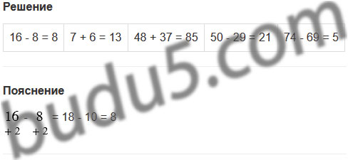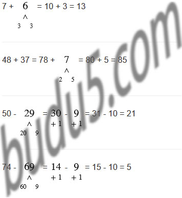 | 16 - 8 | 7 + 6 | 48 + 37 | 50 - 29 | 74 - 69 |
