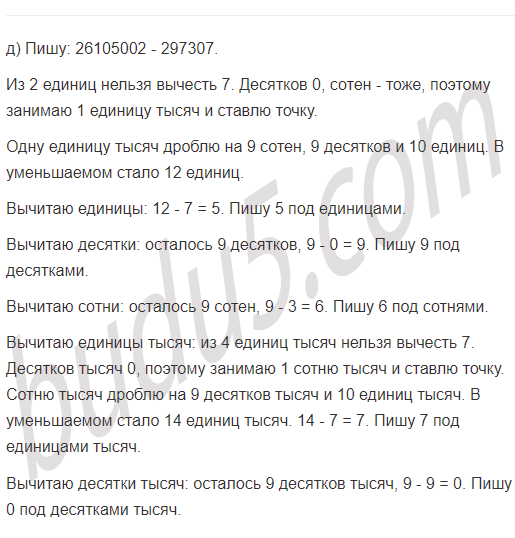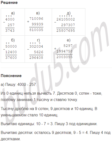| а) 4000 - 257 | в) 710096 + 99939 | д) 26105002 - 297307 |