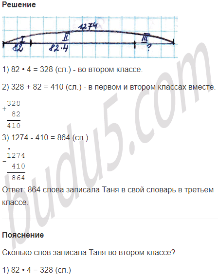 Задание № 7. В первых трёх классах Таня записала в свой словарь 1274 английских слова. Из них 82 слова она записала в первом классе, а во втором классе - в 4 раза больше слов, чем в первом. Сколько слов записала Таня в свой словарь в третьем классе?
