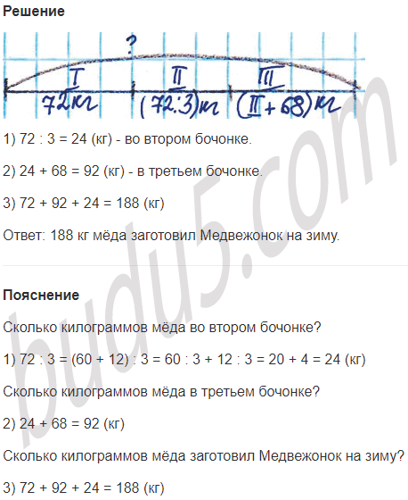 Задание № 11. На зиму Медвежонок заготовил три бочонка мёда. В первом бочонке было 72 кг, во втором бочонке - в 3 раза меньше, чем в первом, а в третьем - на 68 кг больше, чем во втором. Сколько килограммов мёда заготовил Медвежонок на зиму?